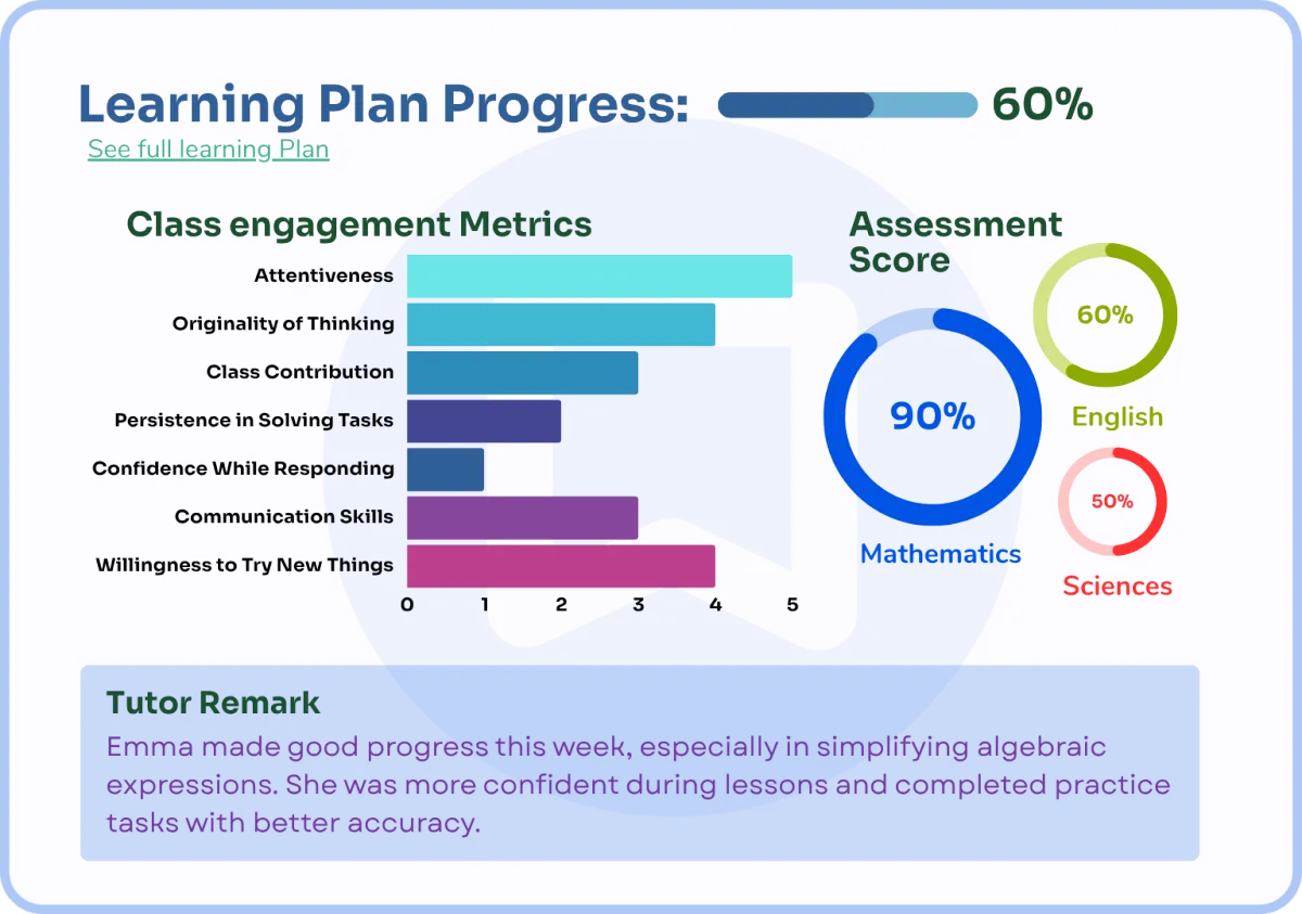 We start by understanding your child's strengths and learning gaps with curriculum-aligned assessments. This helps us create a lesson plan tailored just for them—so every lesson focuses on exactly what your child needs to excel — no wasted time, just focused progress.